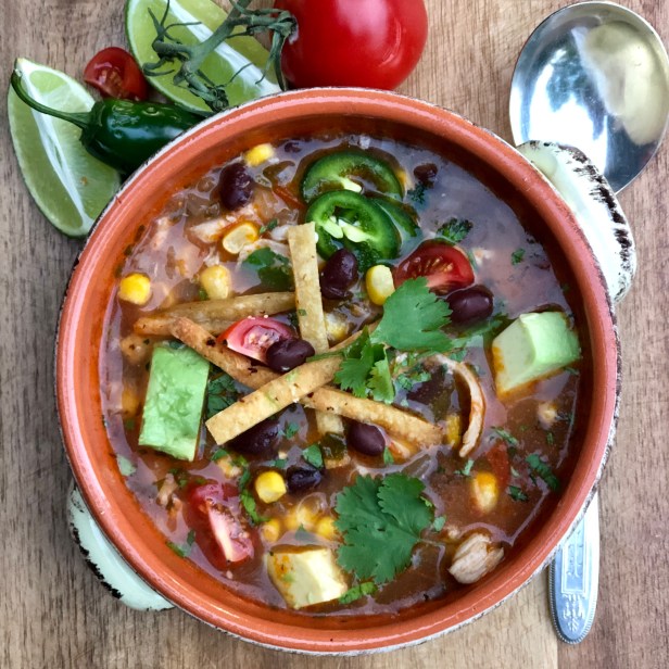 This soup is a staple in the Desjardins home and a perfect way to spice up a chilly night. The best way to start is with homemade chicken stock which gives the soup a wonderfully rich flavor base for this delicious soup. I love adding a little fresh avocado, thinly sliced jalapeño and lime just before serving and even some fresh tomato for a fresh finish to this great soup.