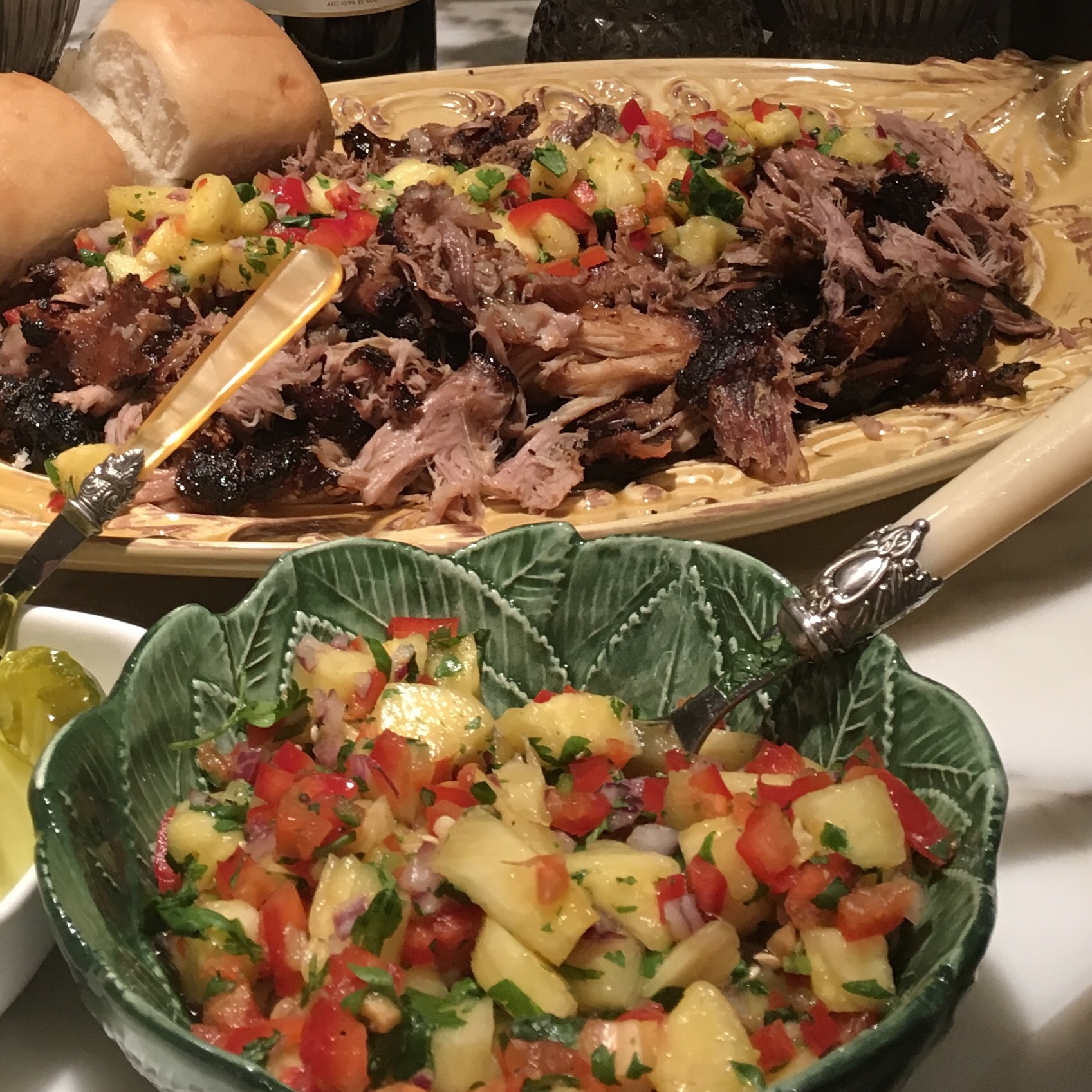 There are many ways to slow roast pork. I often use the crockpot, but this recipe uses the oven and a long brine to get the fall-off the bone effect. The main difference is the crispy outer crust that develops on the exterior as a result of the long brine and the oven roasting process. Serve with pineapple relish, pickles and soft rolls if desired.