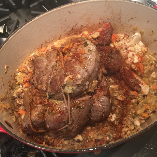 Inspired by my trip to Paris, I decided to serve this tender flavorful lamb. This recipe, adapted from the fabulous Jacques Pépin, is simply a wonderful, earthy dish. I had made it years ago and recently rediscovered his cookbook on my shelf. It is a delicious way to serve the lamb and I use extra vegetables in the cooking process to serve with the meat and juices over creamy, mashed potatoes and sautéed garlic-lemon Spinach. Although the recipe calls for a boneless leg of lamb, I keep the bone in the pot for added flavor and remove it before serving and slicing. The recipe recommends a cast iron pan for cooking, but my Dutch oven has higher sides and works very well if you opt to use extra vegetables.