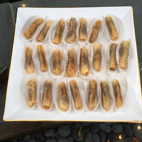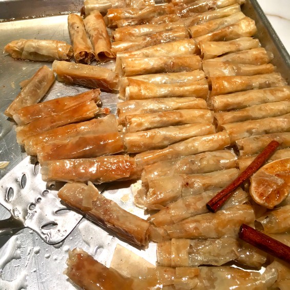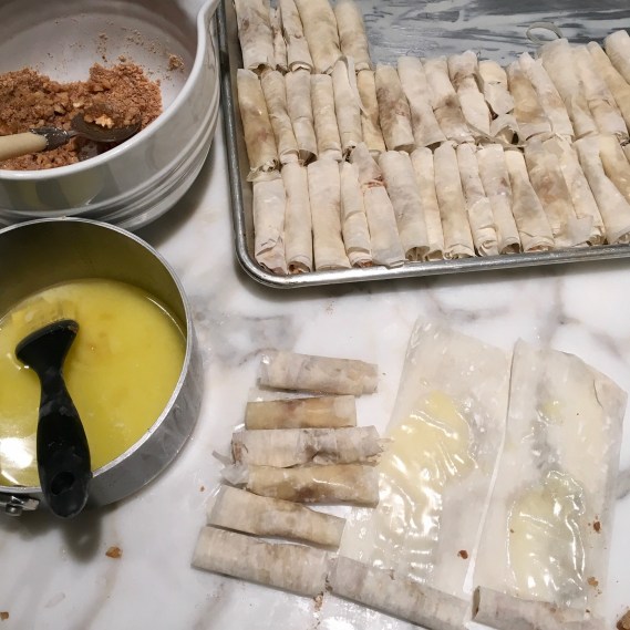 The most common way to enjoy baklava is in a bar form. It is much thicker with layers of filo on the bottom, the nut filling in the middle and more filo on top. My mother’s recipe rolled the nut filling in small cigarette-like pieces that are just perfect for serving and enjoying. Some cooks are reluctant to work with filo dough which is understandable as it dries out quickly, but if you thaw it properly and work efficiently, it is worth the effort.