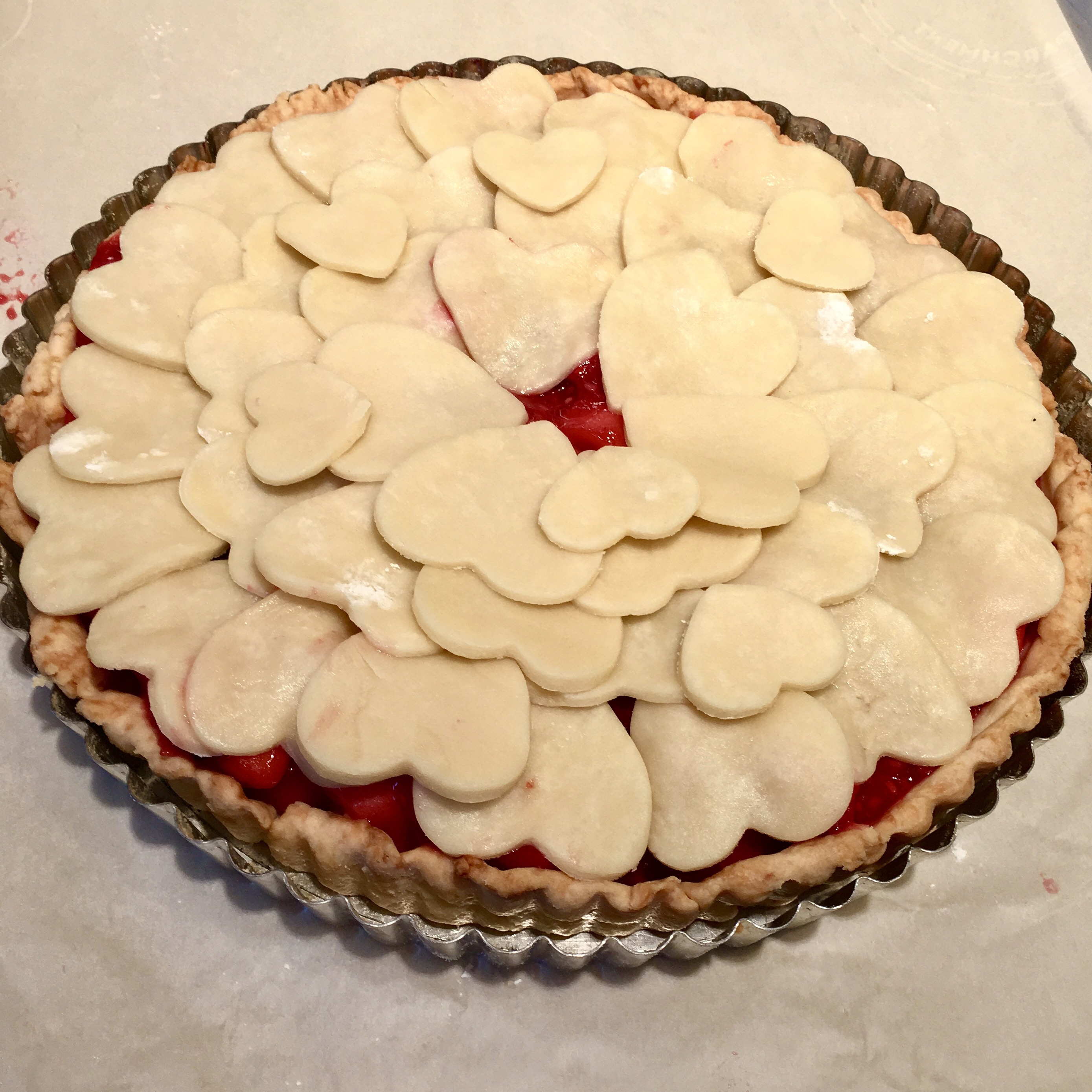 Tart with par-baked bottom crust, filling and unbaked hearts.