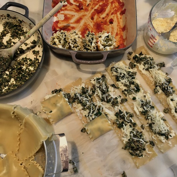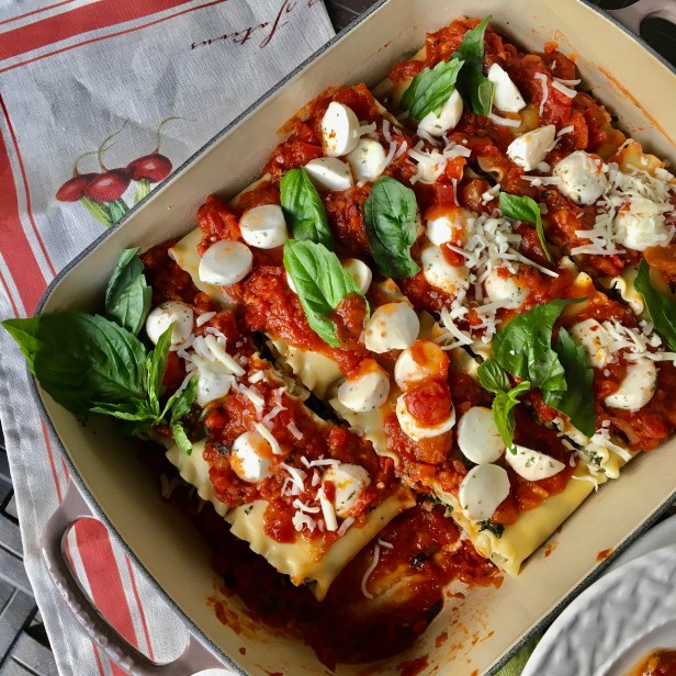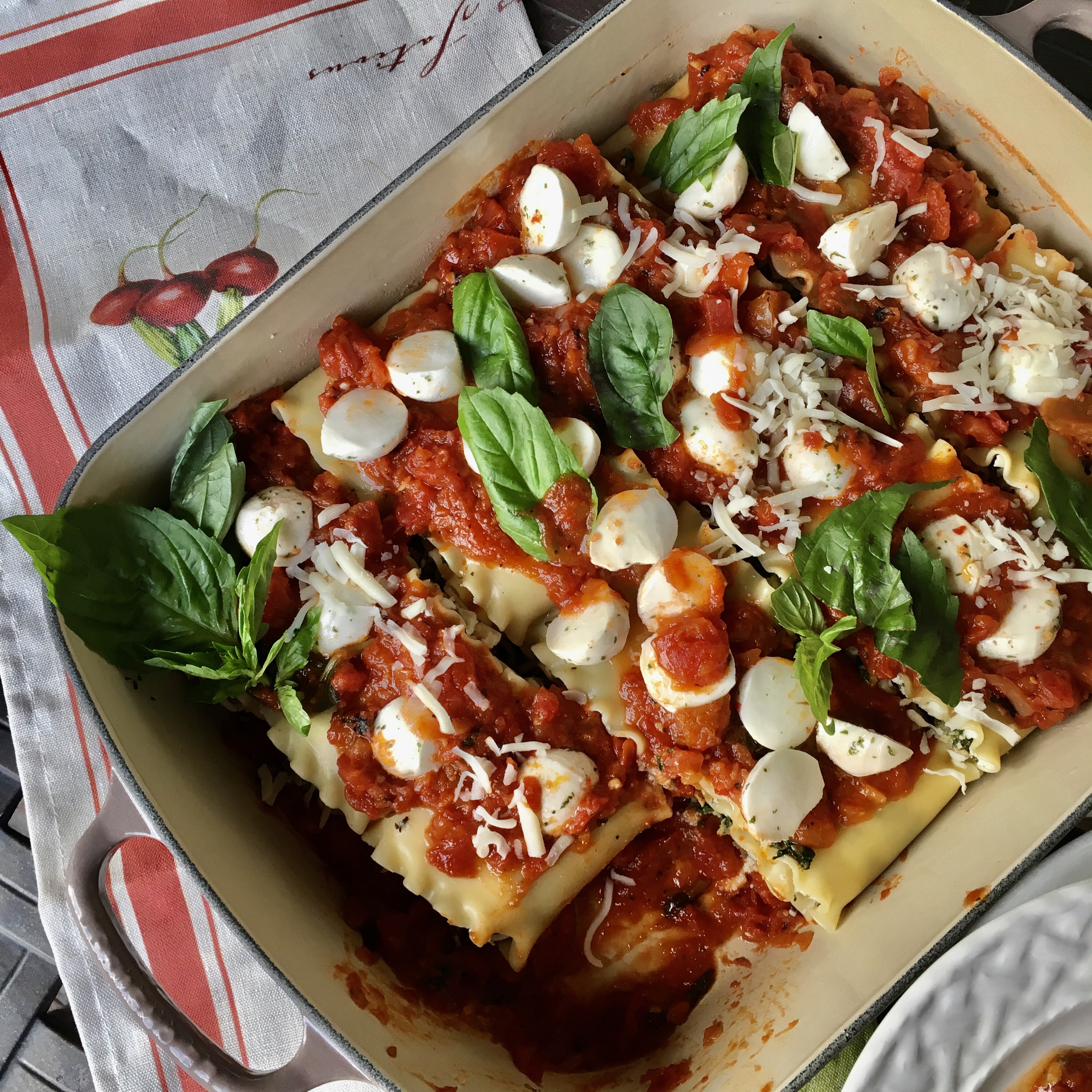 This recipe is a fun take on regular lasagna. I love using the ground chicken which is a lighter fare than ground sirloin and pairs well with the spinach and mushrooms. I usually make double the amount of red-vodka sauce as it freezes well and tastes great on pasta of any kind and makes for a great meal when you are in a pinch. The vodka helps to balance the acidity of the tomatoes and really makes for a delicious red sauce. You can assemble the rolls ahead of time which makes them a great option for a busy family.