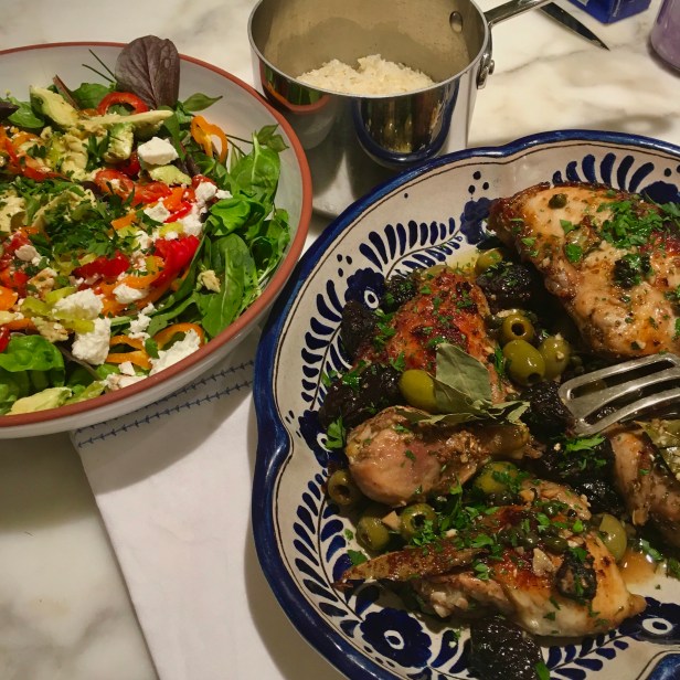 This recipe hails from the Silver Palate cookbook and it is a fabulous recipe that seems special enough to serve to guests, but simple enough for a weeknight dinner. It does require a little planning ahead as the chicken must be marinated overnight, but otherwise it truly is just a matter of roasting for about an hour. Add some rice to help absorb all the juices and a nice tossed salad alongside and dinner is served. I halved the recipe for my family but used the same amount of olives and prunes.