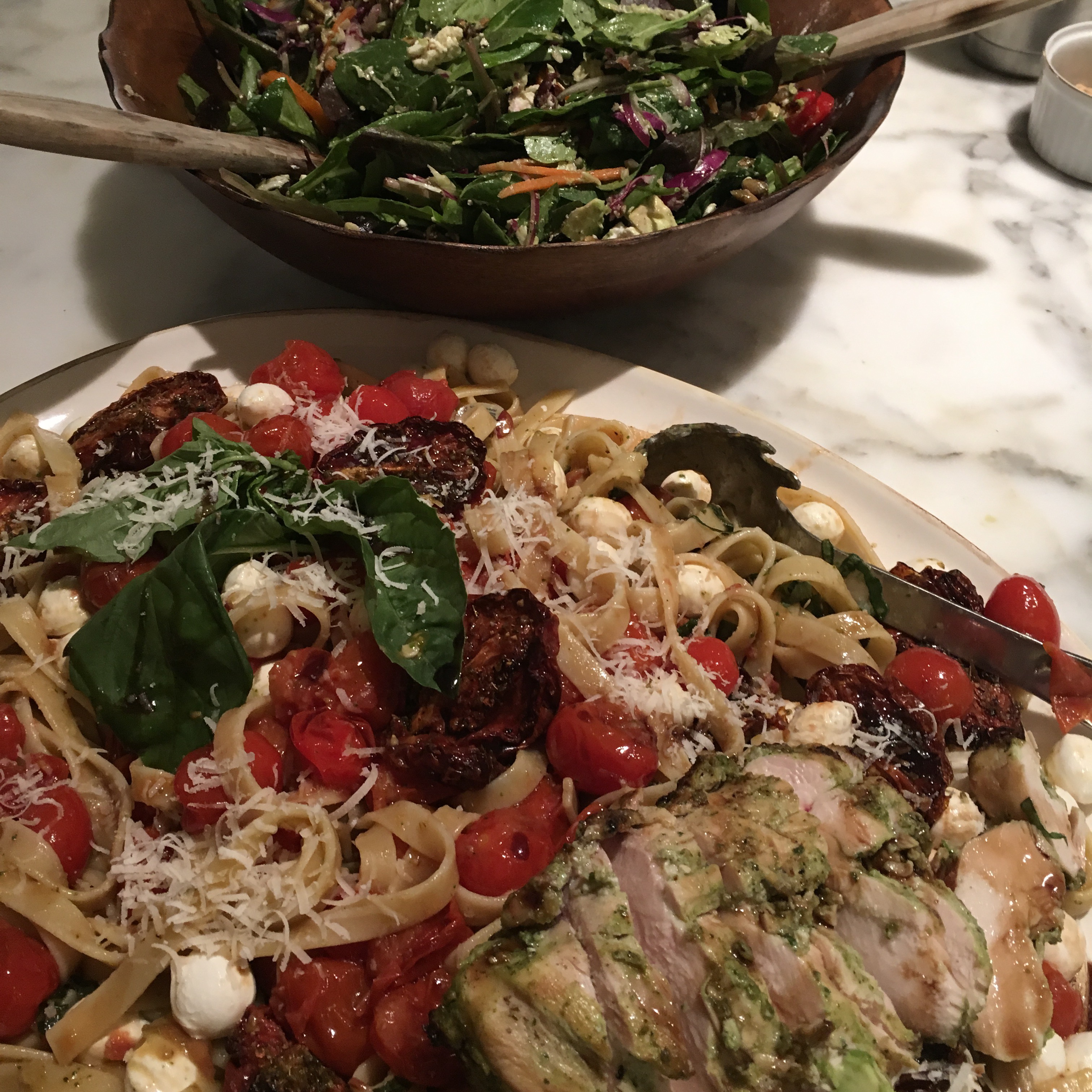 If you are a fan of Caprese salad, this pasta dish is for you. I have added a few things the recipe from Nutmegnanny — I added about 8 slow-roasted Roma tomatoes and stirred pesto in with the tomato sauce for extra flavor and used about twice the amount of mozzarella balls ( I like the pearls). To the sauce I also included chopped shallots along with the garlic. I marinated the chicken overnight in a combination of pesto and buttermilk which tenderizes the chicken before the cooking process.