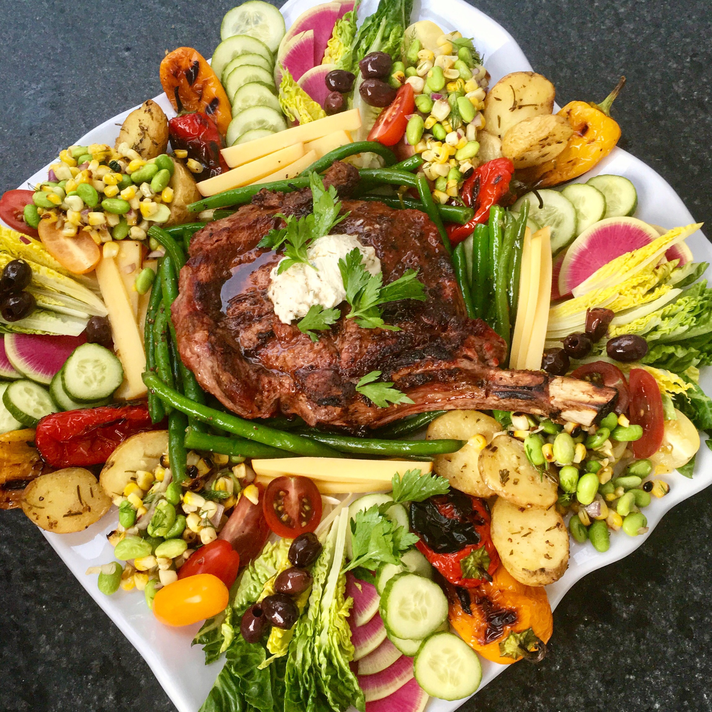 My fridge was filled with an array of vegetables and leftovers and in order to accommodate the meat lovers in the family and the veggie eaters, this steak and salad combo came to be…. you could use many different items to create a lovely dinner salad and avoid wasting great leftover items, that alone are not enough for a meal, but work beautifully in combination.