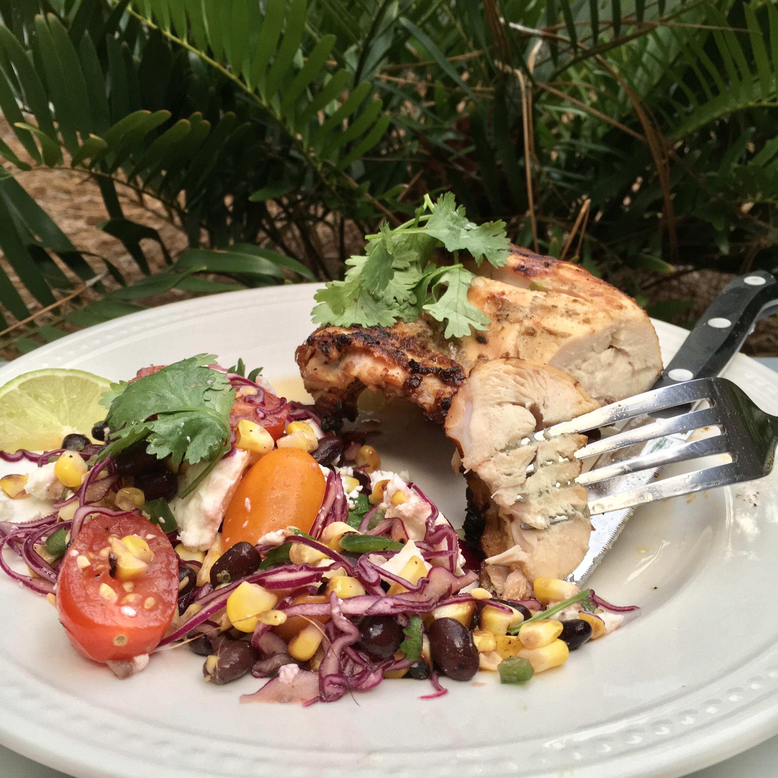 An exceptional weeknight dinner option that is deliciously fresh and healthy. I adapted the recipe from Saveur and added a few more spices to the marinade including cumin, smoked paprika and Penzey’s Adobo seasoning.and let it sit for several hours in about a cup of buttermilk, fresh squeezed lime and a few tablespoons of olive oil before grilling. For the corn and bean salad, I minced some jalapeño and added some cumin and decided to use crumbled feta rather than quest fresco.