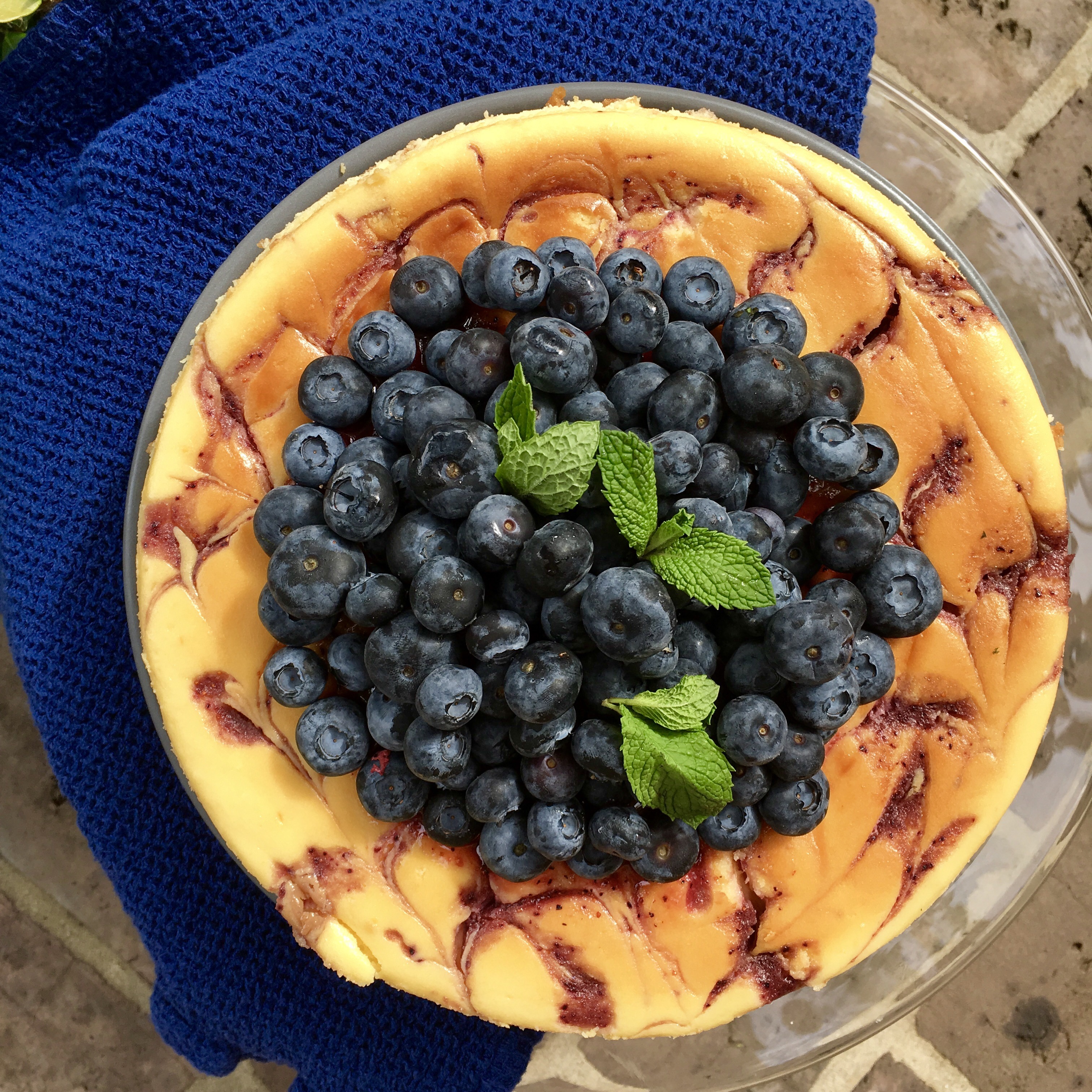 A rich and decadent dessert that highlights summer berries with fresh lemon flavor. The swirled blueberry design is elegant and beautiful. I served this at my daughter’s engagement party and was entertaining a large group, so it was a wonderful make-ahead option. I added the blueberries on top and mint for a lovely presentation.