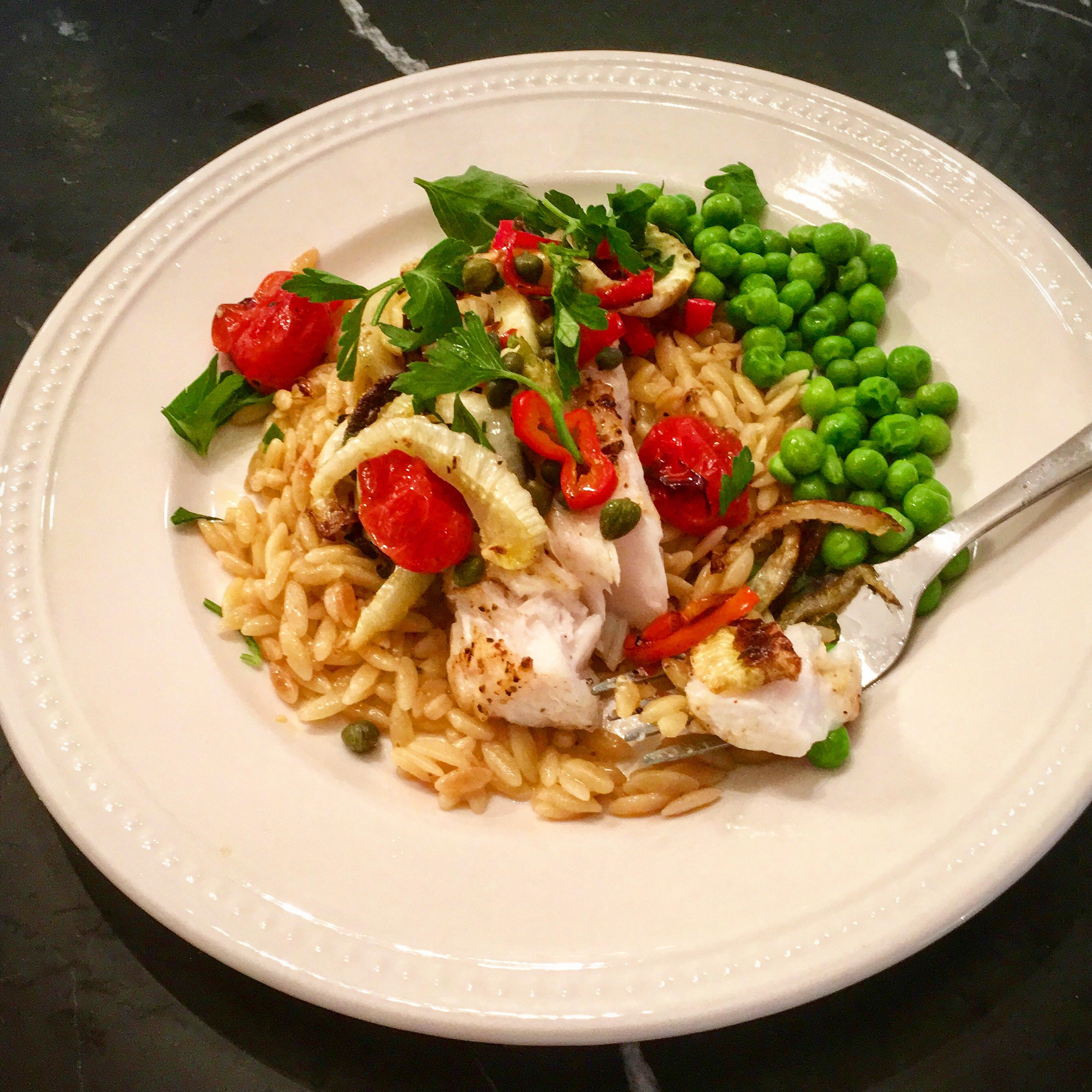 When fresh fish is available, not much is required to produce a delicious and healthy meal. Fennel is a perfect way to add beautiful flavor to fish without overpowering the seafood. I roasted a medley of vegetables and served the grilled fish on toasted orzo. I served this with a helping of sweet peas, but any vegetable would be great.