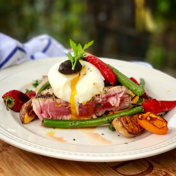 I love a great salad and this version of a Niçoise salad plays with many of the elements of the classic Niçoise Salad. Salad and fish are such a perfect combination, and this version is a play on the traditional salad Niçoise (one of my favorites). Roasted vegetables and the drizzle of an egg yolk from a poached egg are a delicious complement to a a seared tuna steak. On a side note, I have and enjoy poached eggs quite a bit and have found that an egg poacher is a wonderfully easy way to prepare the perfect poached egg that holds together and comes out easily from the non-stick poaching cups. If you are a fan of poached eggs, it is worth the small investment.