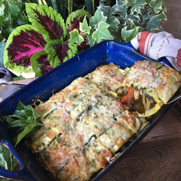 This vegetarian dish makes use of a summer harvest of vegetables. The dish can be a bit watery, so it is important to dry tomatoes a bit before baking and allow gratin to sit for several minutes before serving. The juices however are incredibly flavorful and a fine way to enjoy summer produce.