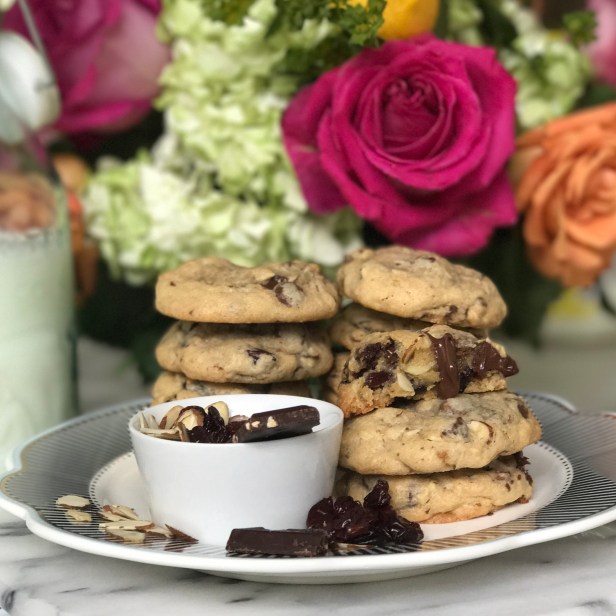 Dark Chocolate +Cherries +Almonds are a great combination and these cookies capture the bittersweet of dark chocolate with the tart sweet of the dried cherries. I used a dark chocolate bar that had cherries and almonds in it, which inspired the cookie, but you could simply use a dark chocolate bar. I prefer a bar to chips as the chocolate melts in bigger chunks and I like that each bite is not uniform.