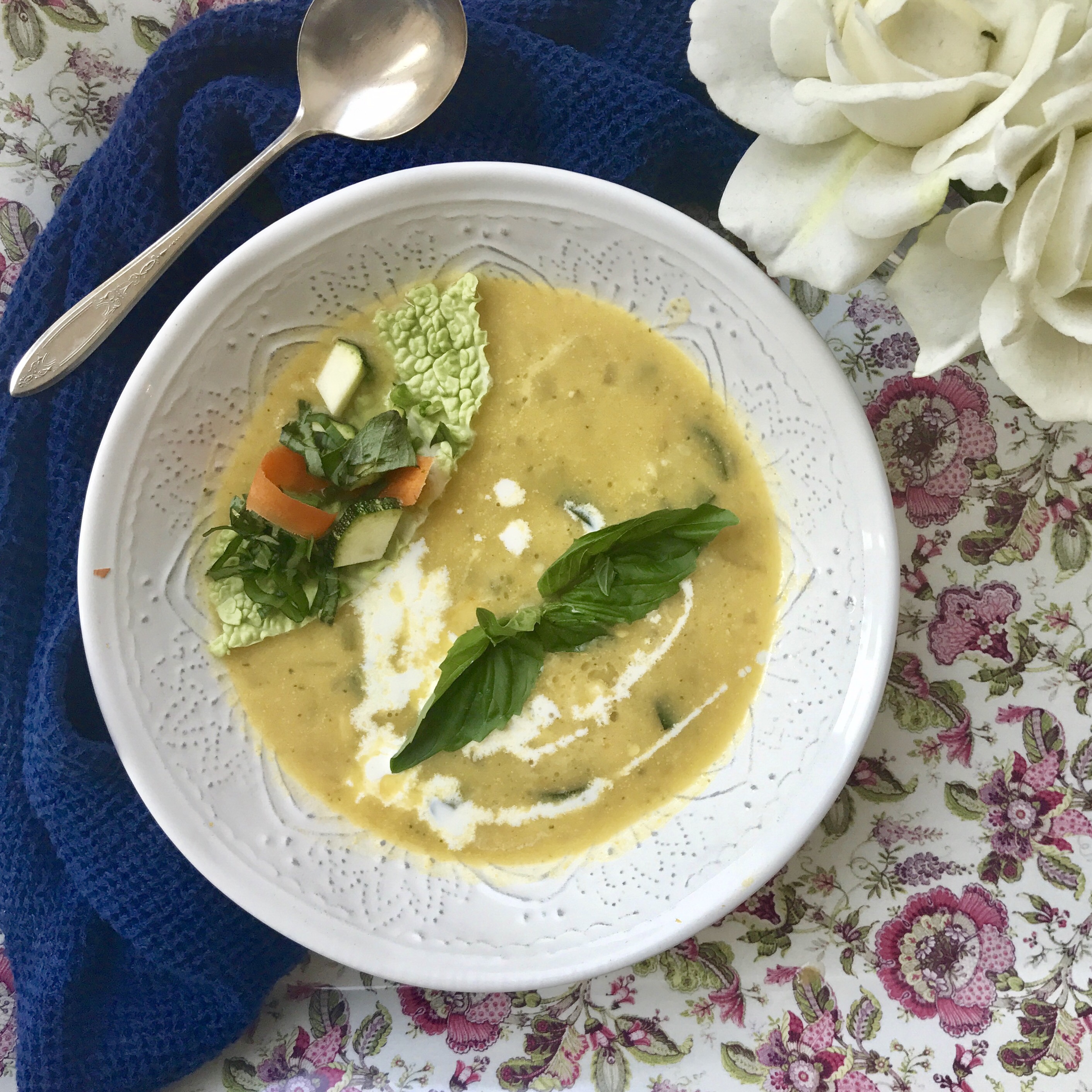 Love this delicious vegetarian summer soup that from Flourishingfoodie. It is so easy to make and just delicious. The addition of coconut milk rather than cream adds great flavor and a nice substitute. If you use olive oil, rather than butter, the soup is a great vegan option without compromising on flavor. The whole family truly enjoyed it! I added some fresh chopped basil and chives to give it a bit more flavor right before serving, and garnished with some shaved carrot and zucchini on a cabbage leaf. I would recommend using 4 ears of fresh corn, and an additional zucchini for a chunkier soup.