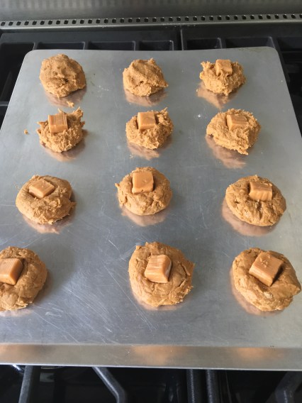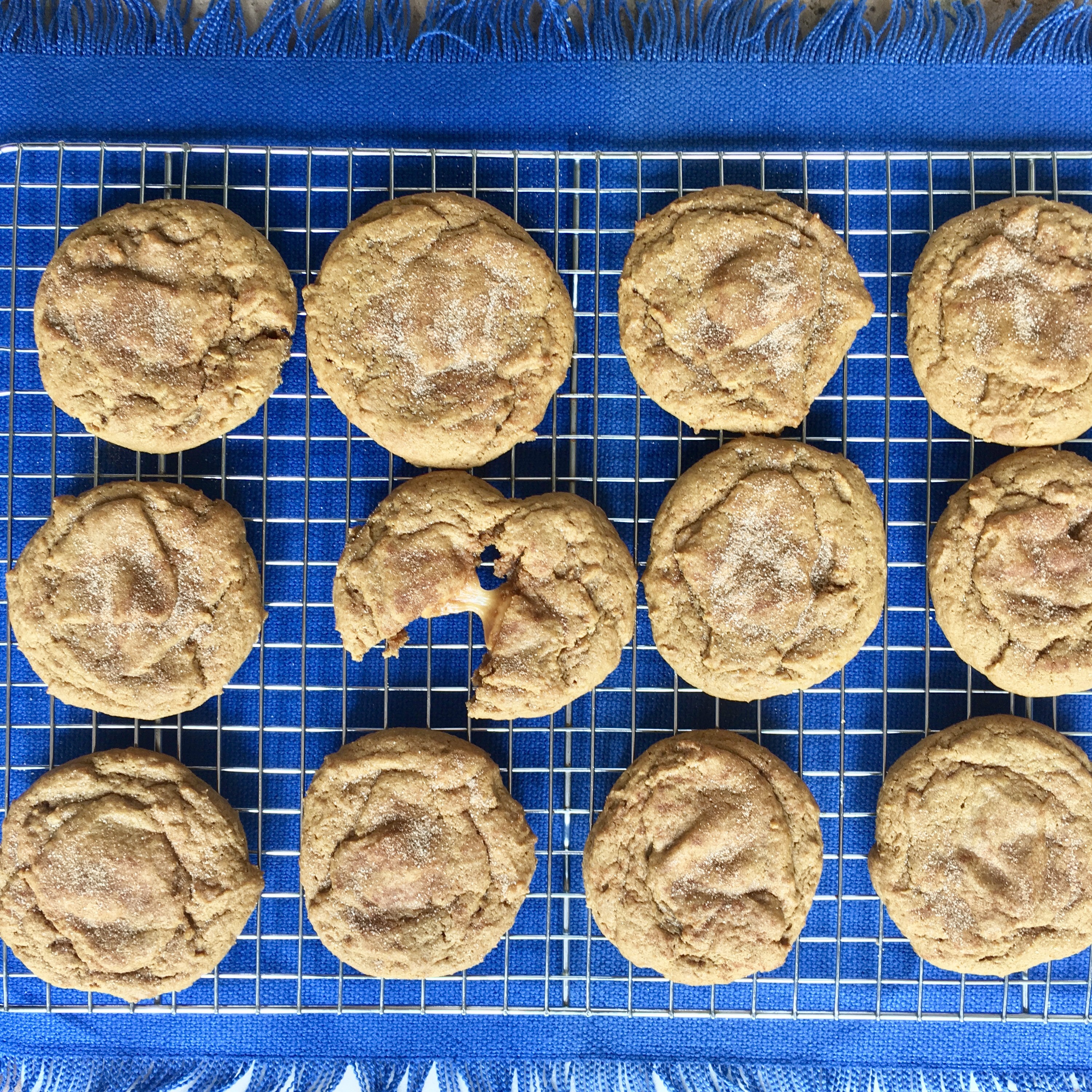 I have been working on a pumpkin cookie recipe for some time. I love the taste of pumpkin, but was looking to avoid the cake-like texture that characterize most pumpkin cookies. The issue is the water content in the pumpkin purée, so I tried to address this by using an egg yolk rather than an entire egg. This helped with the texture along with some additional adjustments in the baking powder and soda and the three kinds of sugar in the recipe. I love the addition of the caramel in the middle. It requires a little extra work, but yields a really special cookie.