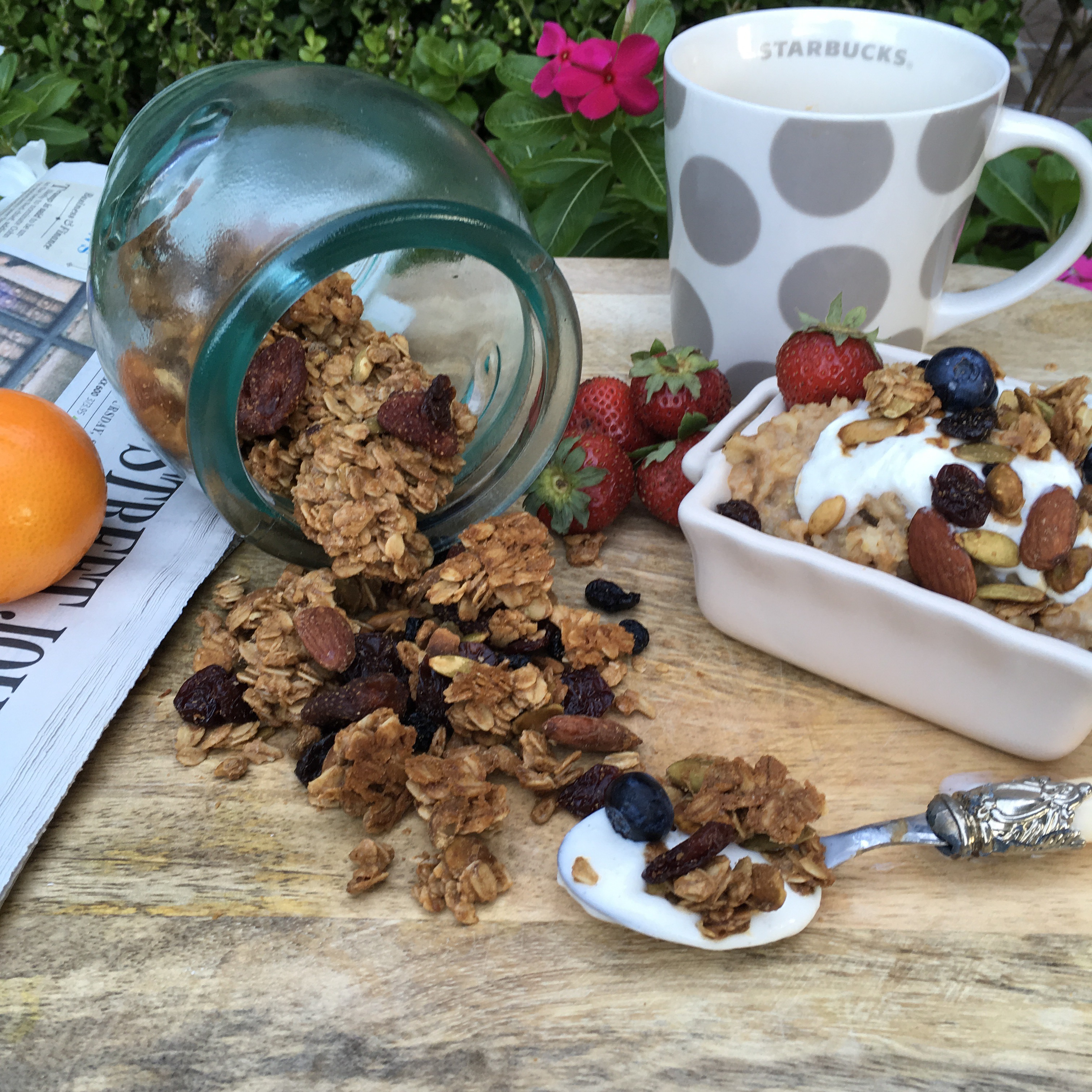 Homemade granola provides a wonderful palate for a variety of flavors. I used three kinds of nuts for this version and some almond extract along with three kinds of dried berries. A delicious serving suggestion is to sprinkle a handful of granola on your oatmeal adding great crunch and flavor to a breakfast of goodness.