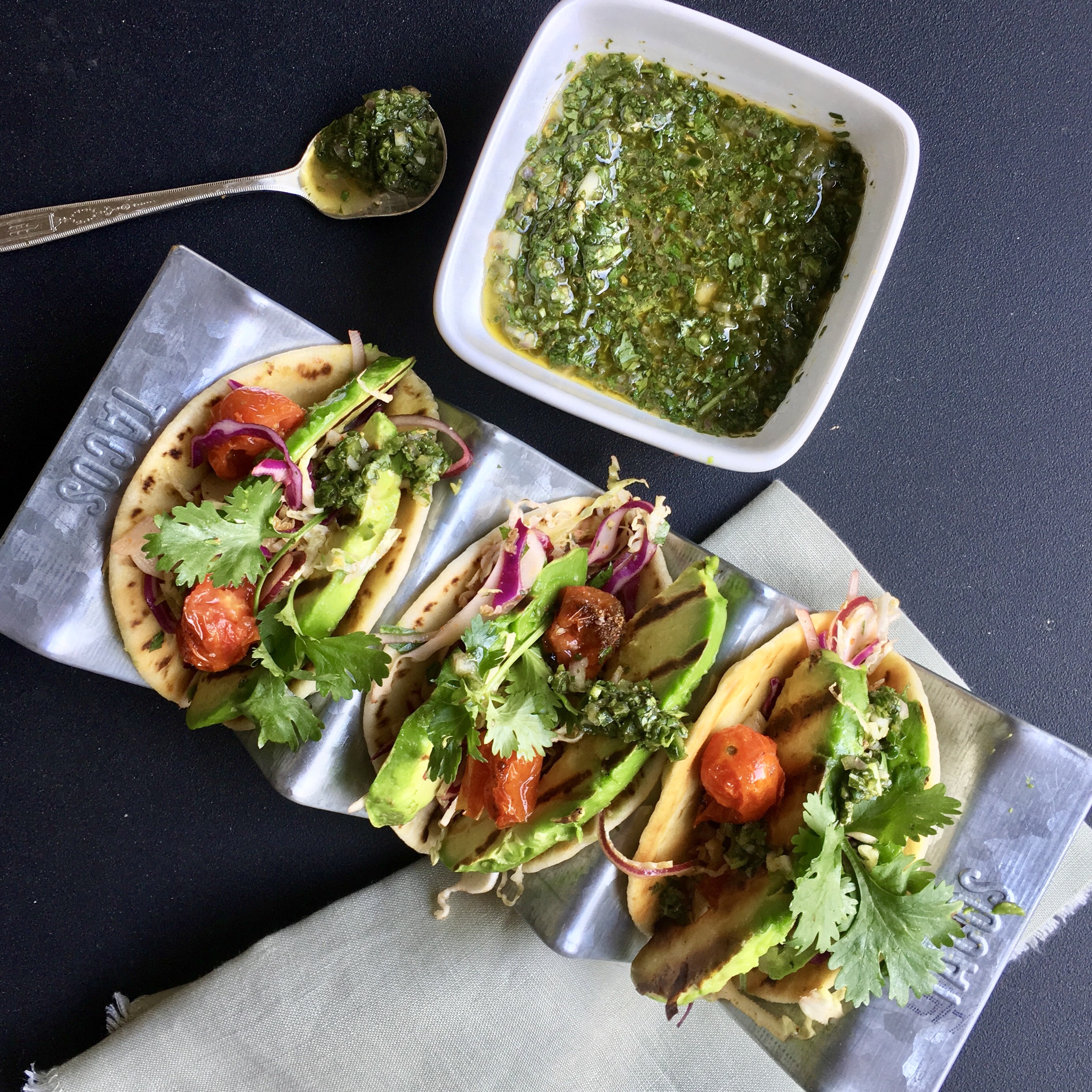 Love these small tortillas which are the perfect way to enjoy delicious bites of flavorful mexican food. These small tortillas hold a spoonful of slaw, some creamy grilled avocado, blistered cumin tomatoes and a drizzle of chimichurri. If you can’t find the smaller size tortilla, you could use a biscuit cutter to cut out a smaller size tortilla.