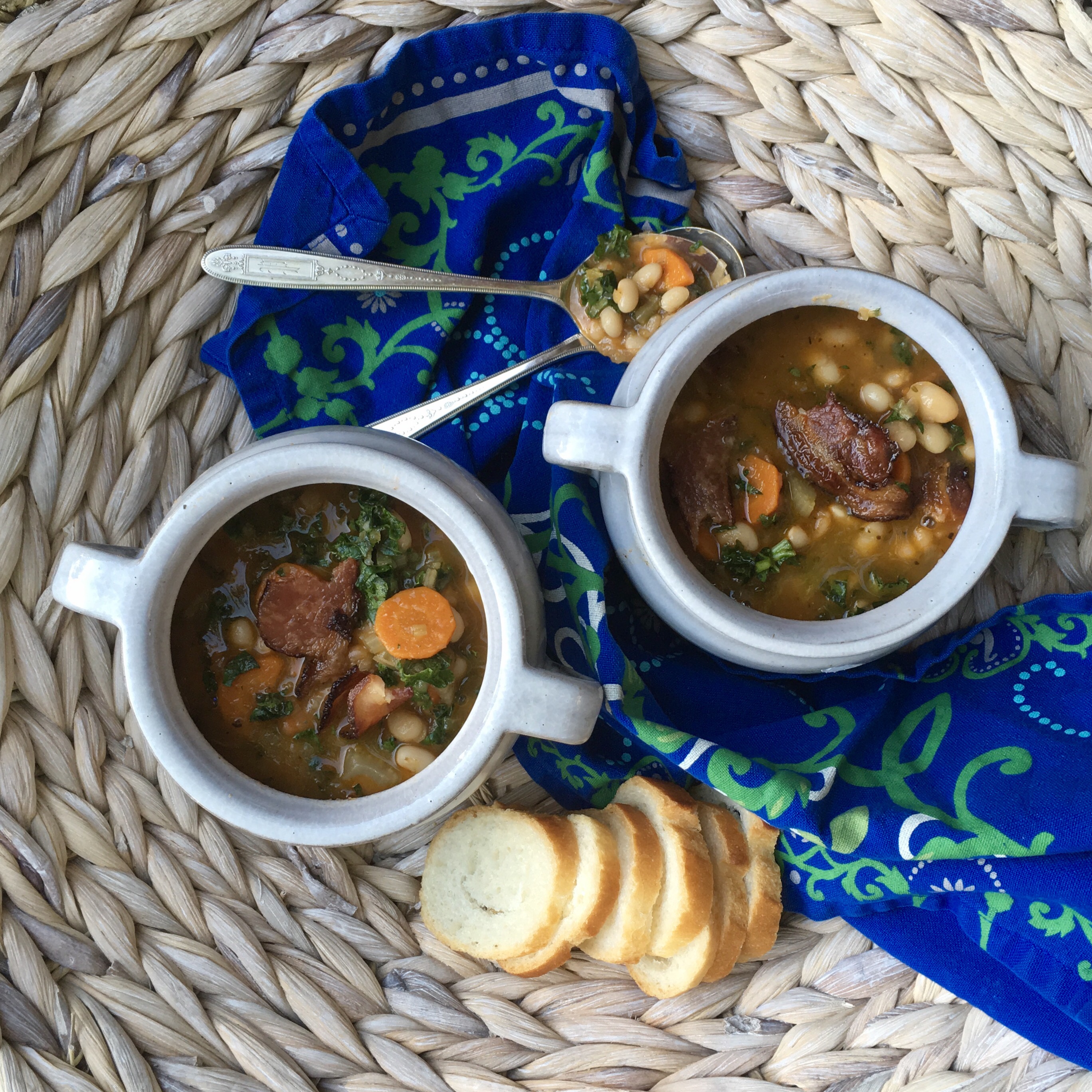 Although chillier weather had not quite made an appearance here in the South, this hearty soup is a great way to prepare. The smoky ham hock that stews with the beans provides delicious flavor to the stock which is rich in flavor. The kale holds up well in the soup and adds a nice texture and added nutrition.