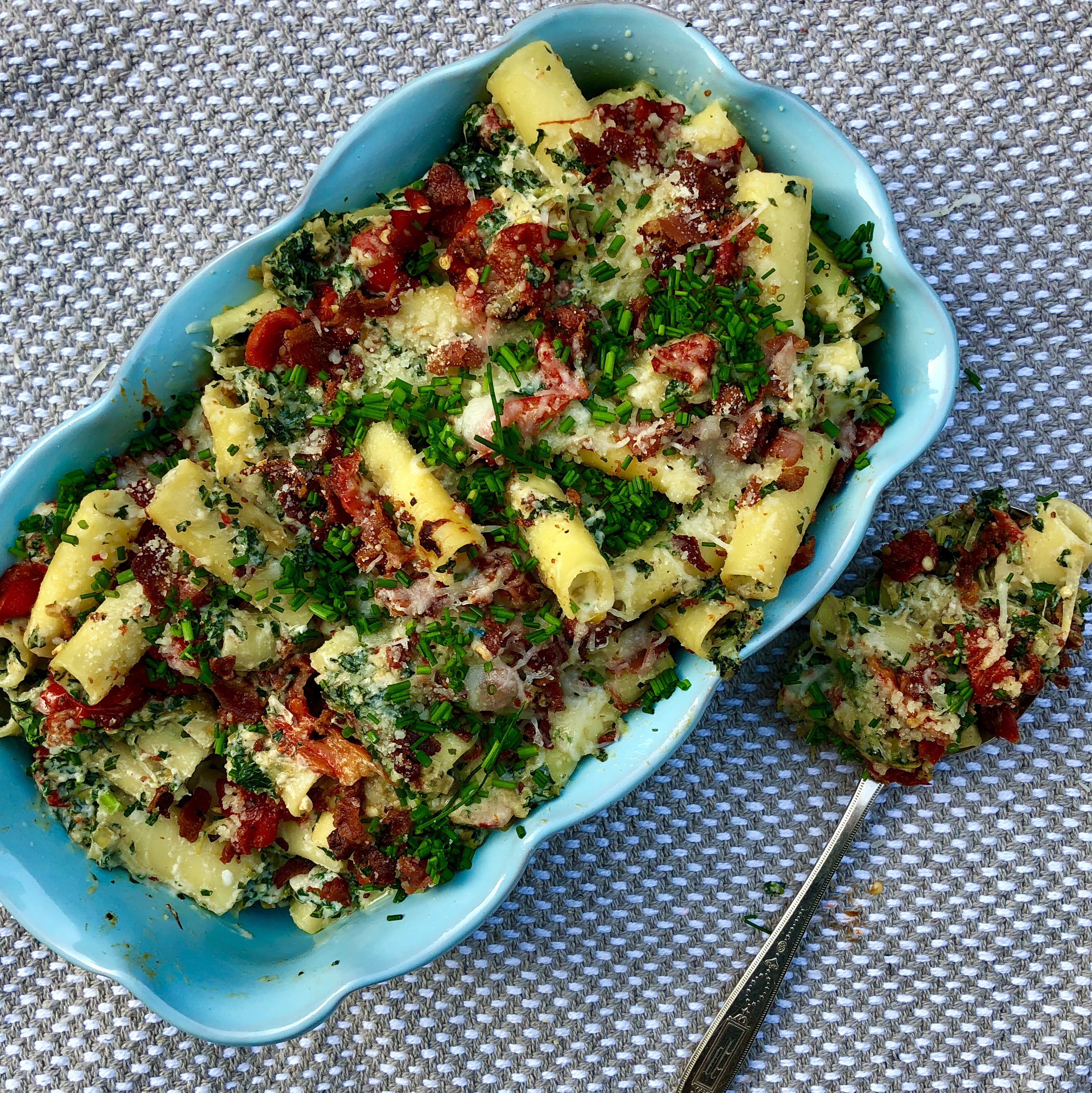 A make-ahead pasta that sneaks in lots of healthy veggies and works well for a busy family great as a make-ahead meal. I love using kale instead of spinach as it has less water and holds up well in a baked dish. It does require some extra chopping but well worth it. The ricotta helps bind the pasta and adds a creaminess without being overly heavy. If you wanted a vegetarian version, simply eliminate the Pancetta. Reheat just before before serving for best results!