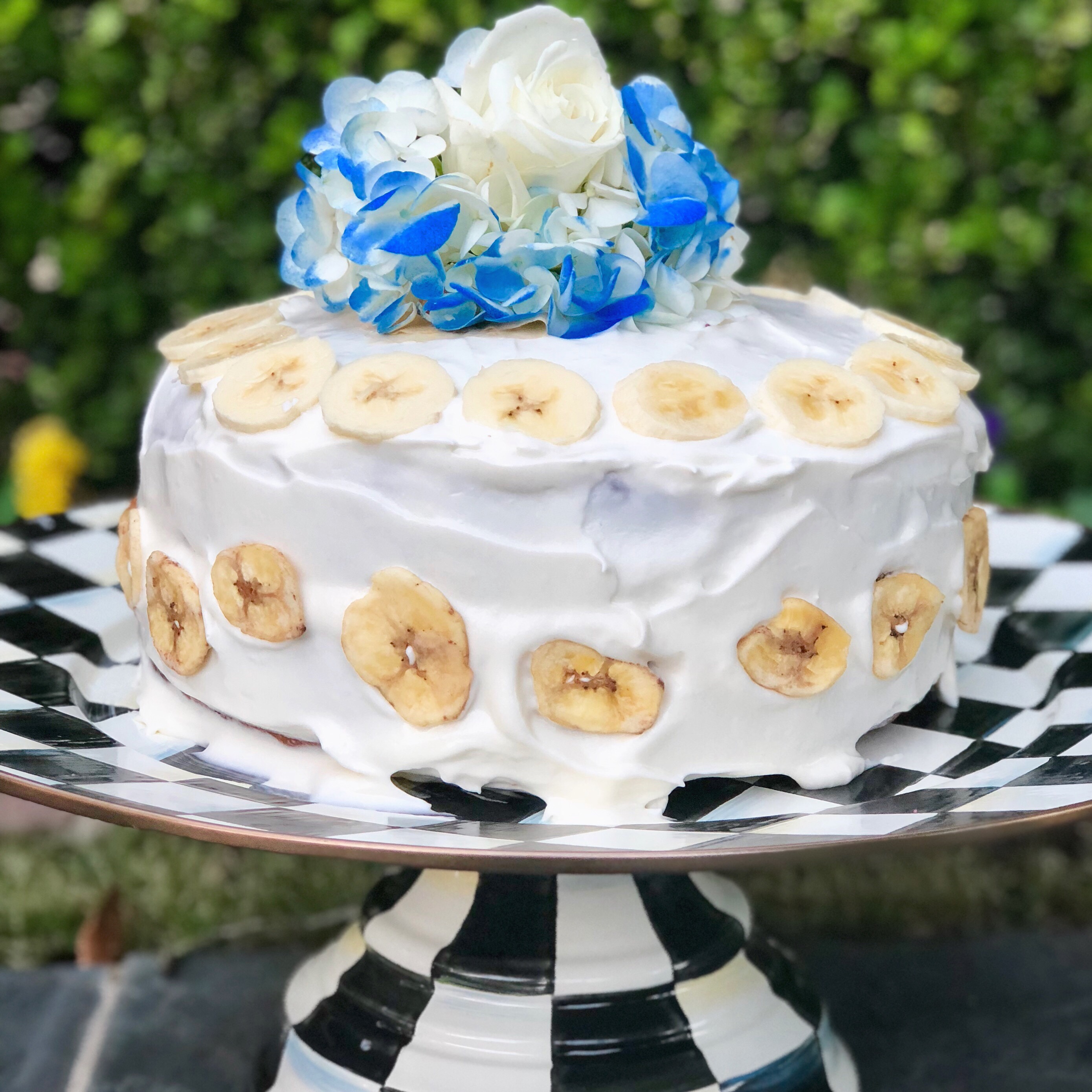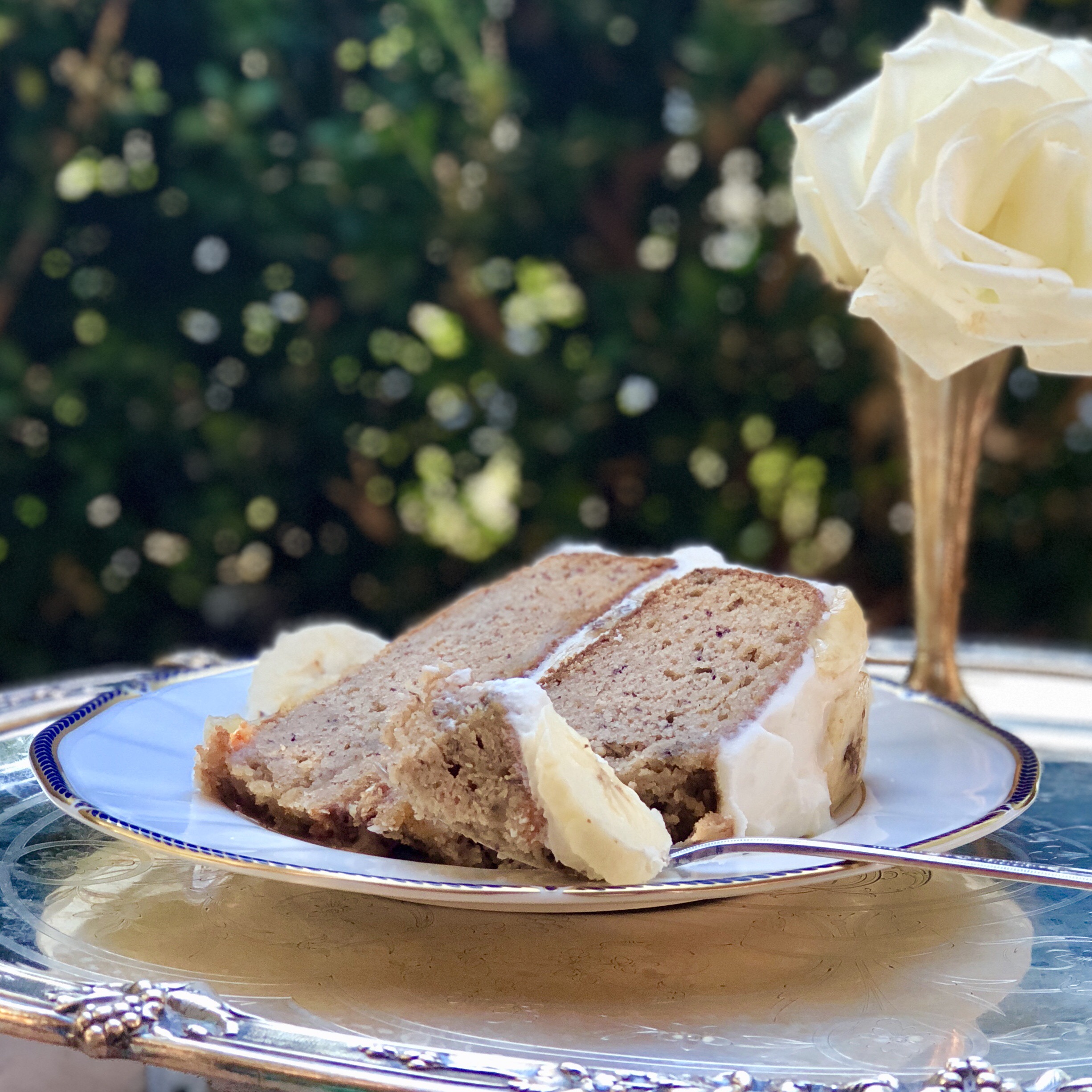 Celebrating birthdays requires special indulgence. When Daphne, my oldest daughter, Daphne requested something with bananas, I came up with this re pie that is a cross between a bread and a cake in one. The riper your bananas, the better the flavor for this cake. The indulgent frosting adds an extra layer of indulgence to this moist and decadent cake. The addition of flowers on the top is always a beautiful and delicate accessory that makes the cake that much more special.