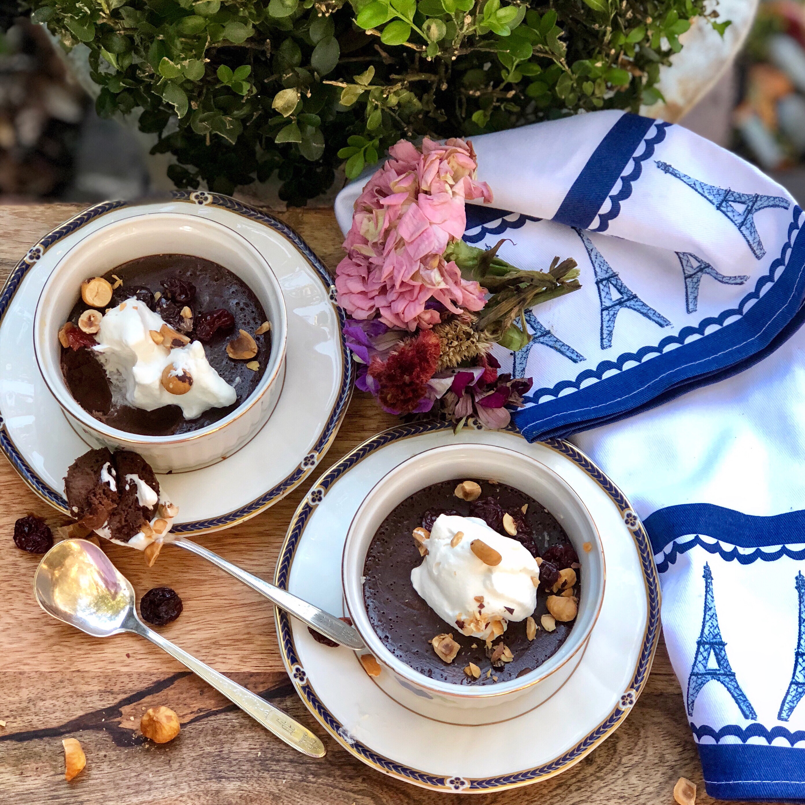 I had a lovely reason to serve these decadent little Pots de Crėme — a friend who I had not seen in over 20 year’s came to join us for dinner, and this dessert was a perfect way to finish a meal of catching up, laughing and reminiscing. Use a high quality chocolate with a high content of cocoa … I selected Valrona with 66 % cocoa content. While the dessert is rich, it is not overly sweet and the amaretto soaked dried cherries and toasted hazelnuts are wonderful. Don’t leave out a scoop of whipped cream….it’s everything!
