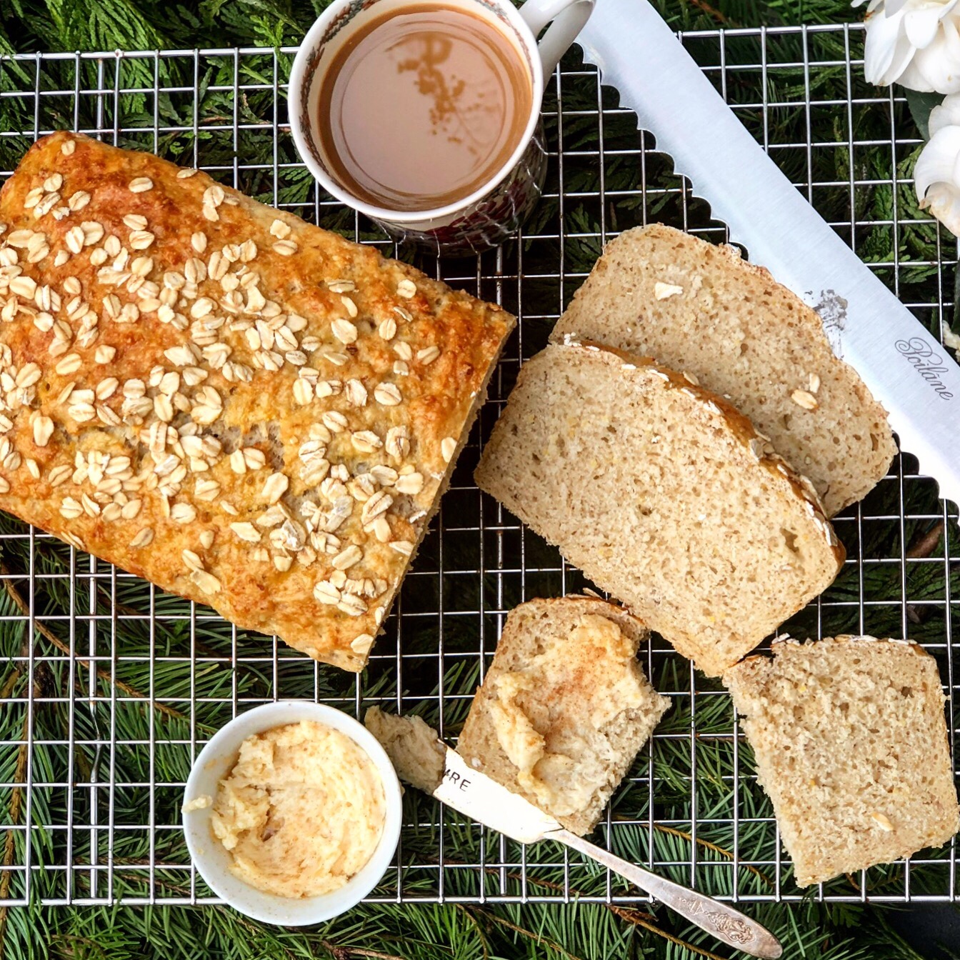 This bread uses my favorite baking flour and cereal products from Bob’s Red Mill. The extra thick oatmeal is a favorite whenever I prepare hot cereal. The bread has a lovely wholesome flavor and makes wonderful toast. The smell in the kitchen is irresistible and there are few things as satisfying as freshly baked bread.