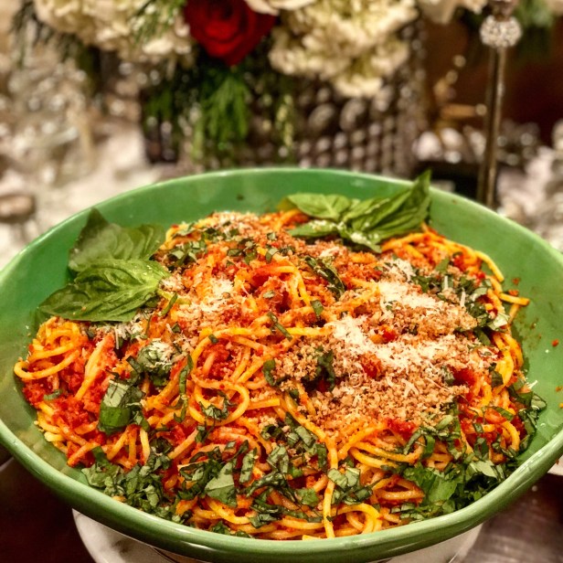 I adapted this recipe from Food and Wine and love its simplicity, beauty and flavor. I changed a few things from the original recipe by using dried sun dried tomatoes not packed in oil, adding my own olive oil. At my local market they carry lovely sun dried tomatoes. You could drain sundried tomatoes and add your own high quality olive oil. I also included some crushed red pepper and fresh basil to the final version. This dish makes for a beautiful presentation and a healthy side (I served some turkey meatballs for the benefit of my boys) or serve as a stand alone offering.