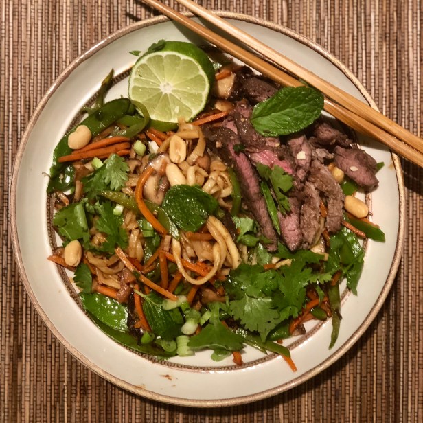 The beef in this dish is pounded flat for a quick sear and rapid preparation making I.T a great weeknight option. The Asian Noodles cook quickly and the sauce is made up of a few simple ingredients. The fresh ginger, cilantro and mint add great flavor and color.