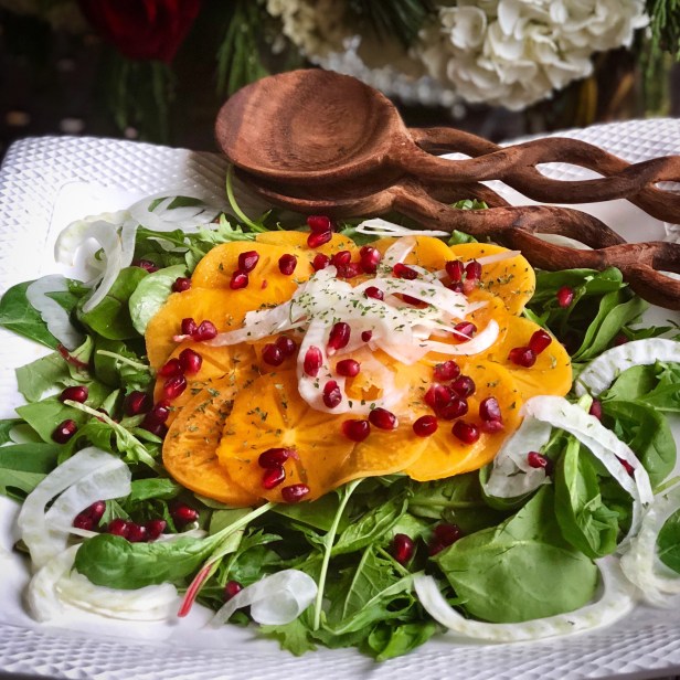 Although it’s winter, it doesn’t mean you can’t make a delicious, healthy and seasonal salad that infuses great color to your meal as well as incredible taste and nutrition. The persimmons, pomegranates and blood oranges are in peak season right now. I think shaving the vegetables is somewhat essential to enable the flavors of the salad not to over power one another. You can use a mandolin or hand shaver. The color of the dressing is rich in color and just perfect with the salad. Next time, I may add some toasted walnuts as well. I think you will really enjoy beautiful simplicity of this gorgeous tasting salad.
