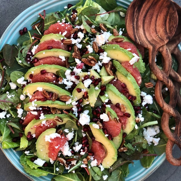 Power up your January with this bright delight. Salads remain some of my favorite creations. They are so healthy, nutritious and delicious. With just a few seasonal elements, a regular salad is easily transformed into something special. My lovely grapefruits were a perfect complement to this winter salad. Segmenting the fruit requires some effort, but the citrus combined with a creamy avocado is so great and so worth the effort. The tangy pomegranate arils and earthy toasted nuts with a sweet honey vinaigrette are delicious. The honey was gifted from some great friends with their own hive in their backyard in Houston — “Gibby honey” and they were so kind to share. It takes eating local to the next level! Lucky me ! I added feta (always that hint of Greekness sneaks in), but you could eliminate if you wanted to avoid the dairy.