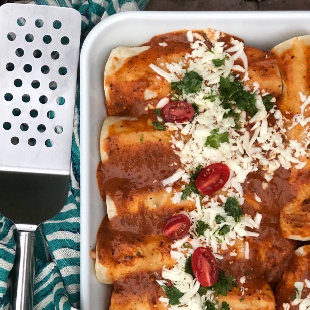 You can’t come to Texas and not enjoy Enchiladas. I have several versions and recipes for Enchiladas on the blog and the real flavor comes from the selection of the chili. While the filling and sauce varies, the celebrated tortilla is consistent. We are so fortunate in Houston to have easy access to amazing tortillas and a wide variety of chilis, both fresh and dried. For this take on the classic Tex Mex offering, I created a beautiful red sauce adding smoky ancho chilis in the roasting process. The Ancho chili, is a wrinkled dried chili – a dried poblano pepper of medium heat intensity. For a less spicy sauce, you can opt for the cascabel pepper. I always use chicken thighs for the filling and added corn and black beans as well. Serve with Spanish rice and guacamole on the side and always a green salad!!!