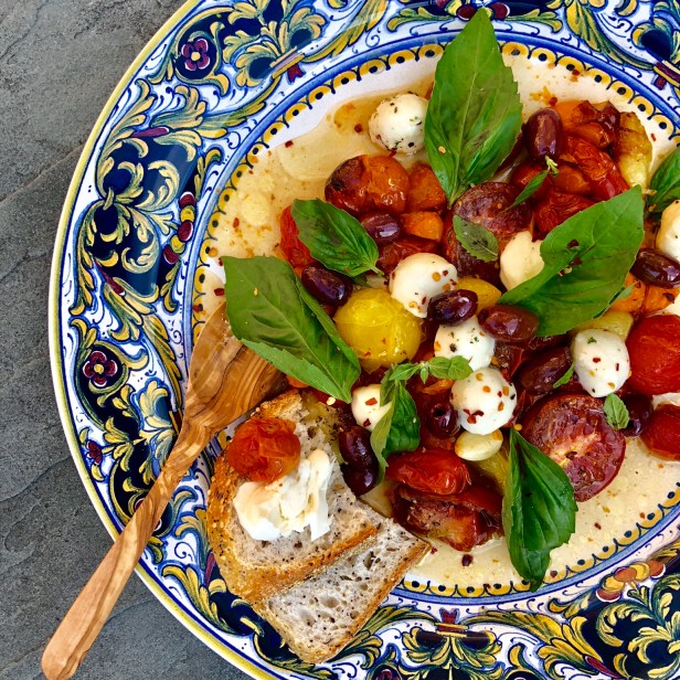 This salad is so delicious and easy and such a fine way to enjoy tomatoes that are not quite as sweet as they are in summer months. I am so lucky here in Houston to have access to incredible produce. For this salad, I selected mostly heirloom cherry tomatoes, some Campari in as wide a variety as I could find. Adding, fresh mozzarella, basil and minimal seasoning was the key, and of course bread to mop up all the beautiful juices.