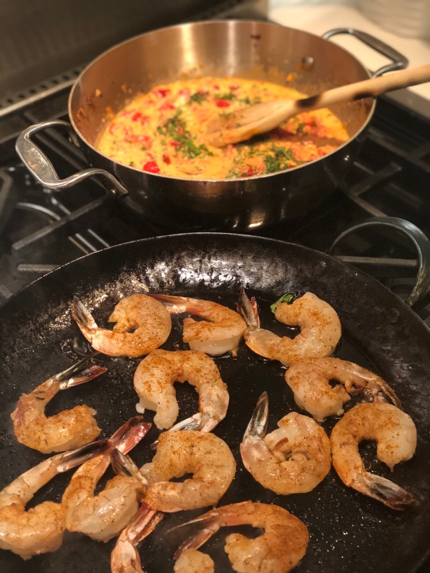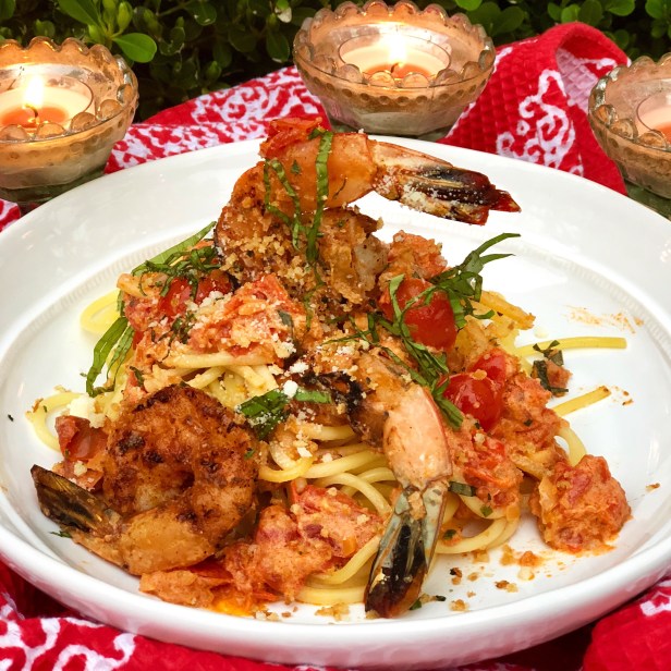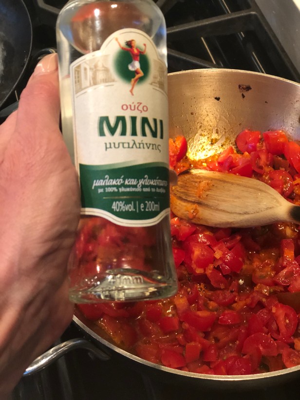 This simple sauce comes together very quickly and gets its lovely flavor from the fresh tomatoes and a splash of ouzo which works beautifully with the seafood and the tomatoes. As always, you should look for the ripest and most flavorful tomatoes available. I love the san Marzano tomatoes, they are dense with tomato flavor and a little less juice than the cherry tomatoes. If you don’t have ouzo, you could opt for a little Pernod instead which will lend the same anise flavor.