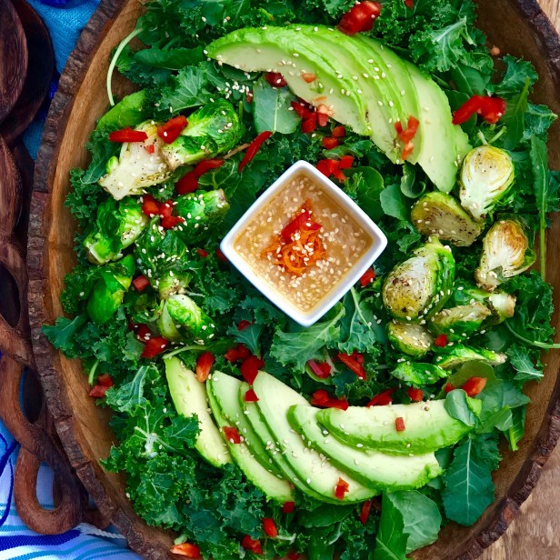 These beautiful kale greens that served as the inspiration for this salad were the gift of some good friends (who are shortly going to be my daughter Daphne’s future inlaws).  I added some more greens and veggies and paired it with this delicious asian-inspired dressing for a most fresh and heathy salad.  If youdoo’t want to chop the kale, I find that giving it a good rub down/massage helps to soften the leaves by breaking down the cellulose.  It makes for a very nice texture that holds up well to the dressing.
