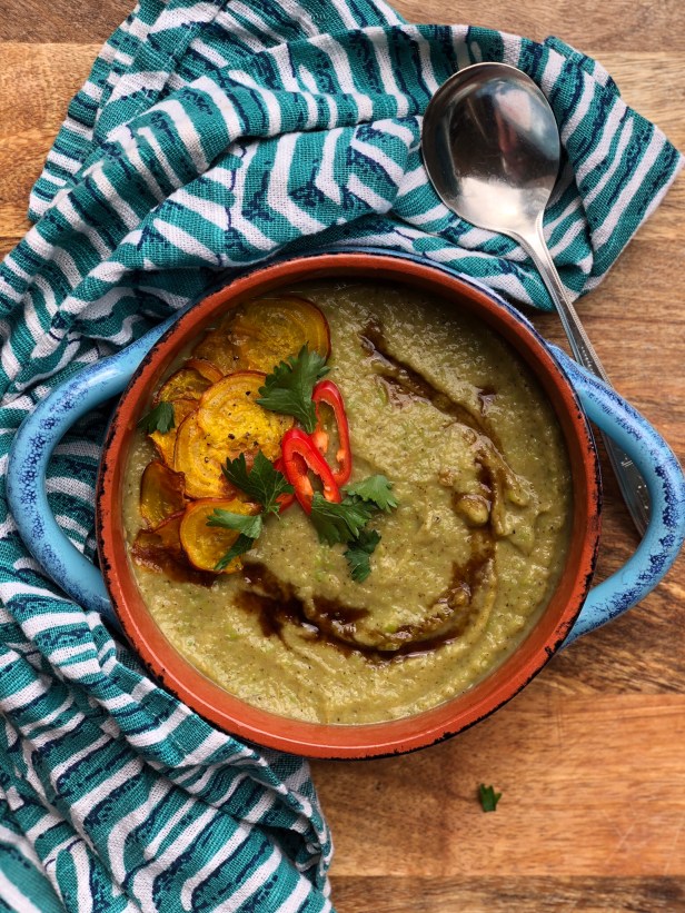 This soup is full of vegetables and relies on potatoes for its creamy consistency. I roasted some sweet golden beets for a hint of natural sweetness and a drizzle of balsamic glaze is added right before serving. I like to roast the broccoli first and then add it to the vegetables as I think the flavor is a bit more complex. The peas are included right at the end of the cooking process for some added natural sweetness and a color booster. Make extra beets as they are wonderful to snack on!