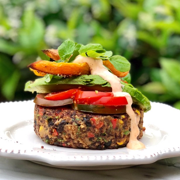 A vegetarian burger that is infused with wonderful south of the border flavor and some sautéed vegetables that make the this vegetarian delight a bit more interesting. I have found that pulsing the beans with the quinoa in the food processor helps to bind the patties more effectively. I also like to use a ring mold to shape my burgers so they cook in a uniform fashion and make for a really nice presentation. If you don’t have a ring mold, you can use an empty can to help shape, a burger mold or your hands. Serve these burgers topped with your favorite sliced vegetables and a side of baked sweet potato fries for a delicious and healthy meal.