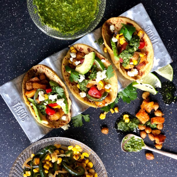 The versatility of tortillas makes them a perfect host for so many amazing combinations of food. Tacos are a family favorite and this vegetarian version uses Mexican flavors to help elevate your vegetarian taco game. Roasting the chickpeas with the squash adds a lovely crisp texture and adds a nice roasted flavor.