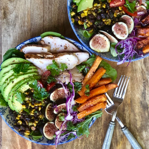 These bowls packed with color, flavor and health make a great dinner any day of the week. I top the salad bowls with a bit of dukkah seasoning, but you could use any spice blend that appeals to you. I use my chicken recipe that is my staple and the first recipe I posted on my blog. It is versatile and a crowd pleaser.