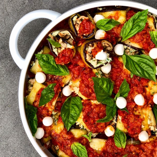 This recipe is healthy and delicious and uses roasted eggplant strips to roll up the ground turkey and ricotta. It’s lighter than a traditional pasta and the pesto flavored ricotta spread is a wonderful combination with the turkey and eggplant. When picking your eggplants, look for eggplants that are as even as possible width-wise so you can prepare your eggplant strips most effectively. I served this with an orzo pilaf and a beautiful fresh salad. My youngest son who claims not to enjoy eggplant really loved this dish! It’s always a coup to turn on one of my diners to a healthy dish that they don’t expect to love!