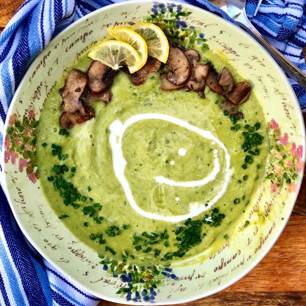 Directions: Preheat oven to 400. Spread asparagus out evenly on a baking sheet and mushrooms on a separate baking sheet. Toss both with olive oil to coat lightly and salt and pepper. Roast asparagus for about 10 minutes until tender and vibrant green (the longer they roast, the less bright in color). Once cooled, roughly chop. Remove from oven and set aside. Let the mushrooms s roast for about 15 minutes tossing once if necessary. Remove and set aside. While vegetables are roasting, heat a large sauce pan with 2 tablespoons of oil and add onion on medium heat for about 7 minutes until fragrant and translucent. Add potato and broth and cover and simmer for about 20 minutes until potatoes are quite tender. Once tender, add chopped asparagus with all accumulated juices, parsley Nd chives. Using an immersion blender, blender or cuisinart, purée broth until smooth and creamy. If you prefer a thinner soup, add Additional broth. Add lemon juice and adjust seasonings to taste. To serve soup, ladle soup in bowl, garnish with mushrooms and chives and a bit of cream if using. Enjoy!