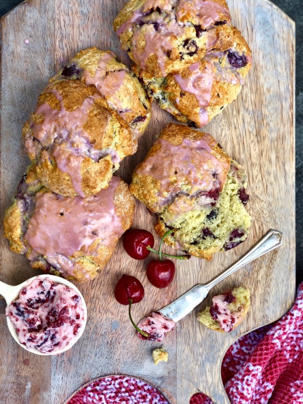I was so excited to see the cherries arrive in the market, and this was a wonderful way to enjoy them. I like to cut these scones in squares, but you could easily make the dough into a round and cut them in a more traditional wedge shape, if you prefer. Either way, they are delicious! The glaze on top is an extra hint of sweet that is such a beautiful color. I decided to make the compound butter so as to avoid wasting any of the cherries. A wonderful complement to the scones!