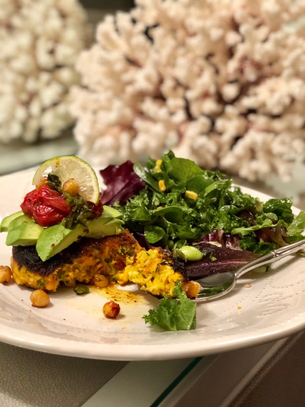 This vegetarian recipe is a nice way to enjoy sweet potatoes. It’s a great option for a light dinner, serve with a nice green salad and can easily get reheated for lunch., or enjoyed in a bun. I start by roasting the sweet potatoes and add grated zucchini that is pressed between paper towel to eliminate some moisture. Love the natural sweetness of the sweet potatoes with cumin and turmeric and crispy chick peas.