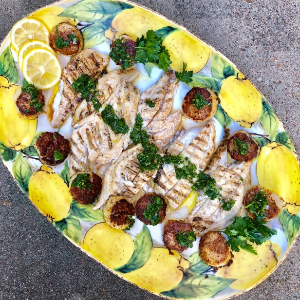 Directions: Place the parsley, mint and shallot in a food processor. Pulse until finely ground. Add seasonings, vinegar, lemon juice and olive oil and pulse again until well combined. Adjust seasonings to taste and Preheat your grill to 375. Spray with cooking spray. Melt olive oil with butter in a small microwavable bowl. Season filets with salt and pepper. Place fish filets skin side down first for 5 minutes. Take half of butter-olive oil mixture and baste the top of fish with marinade. Gently flip fish on other side and cook another 5 minutes or so. Remove from grill and keep warm. Heat a large skillet with remaining olive oil and butter on medium-high heat. Pat scallops dry with paper towel and season with Old Bay Seasoning. Sear scallops on either side for about 4 minutes until golden on each side and cooked through. Place filets on a large platter and surround with scallops. Squeeze fresh lemon over fish and scallops and drizzle chimichurri on top of fish. Serve immediately and enjoy!