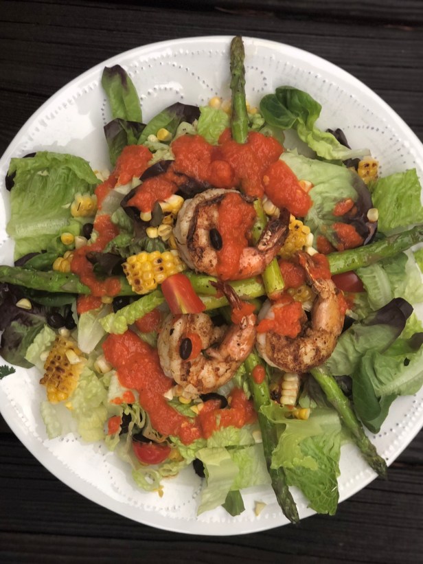 assemble salad: Distribute greens among plates. Arrange roasted asparagus in star-like formation around salad plate. Distribute corn evenly among plates, along with black beans and tomatoes. Place 3 shrimp in the center of each plate. Spoon red bell pepper dressing on salad and vegetables, with extra on the side if desired. Serve immediately and enjoy!