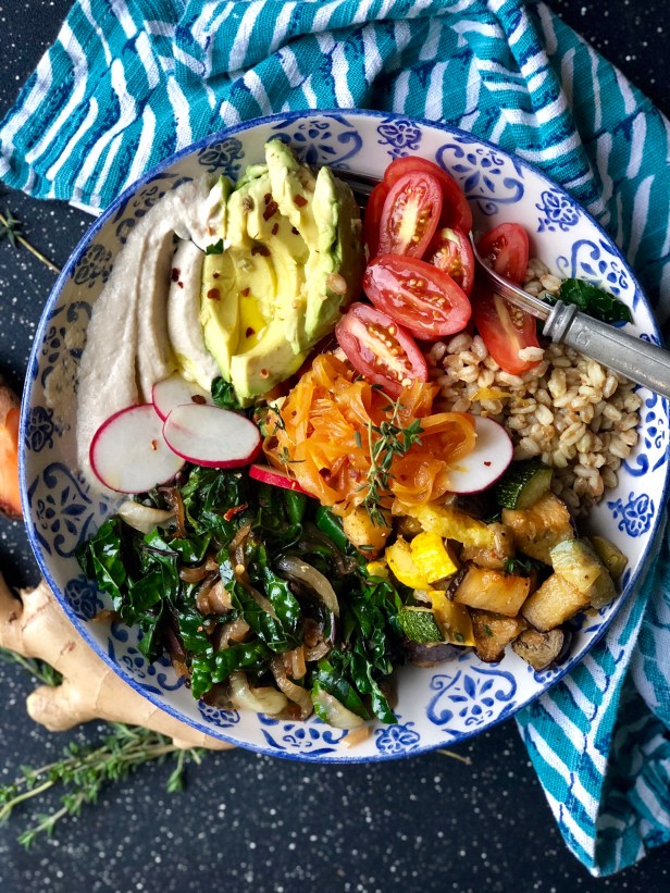 I read a fascinating article in the WSJ this weekend about the “mind-gut” connection and how influential certain foods and spices are in the health of our mind and our general well being . The article also included a recipe which I have posted, although I adapted it a bit to cater to my personal taste. I loved the nutty farro in the recipe and the cashew cream was absolutely delicious to which I added just a bit of sesame oil and extra lemon. In addition, I sautéed some mushrooms with the Swiss chard for the vegetable portion and I roasted diced zucchini, squash and eggplant with olive oil and thyme in the oven, I also added added some sliced radishes. The pickled onions with the ginger and tumeric were just delicious. This recipe could be easily adaptable to a variety of healthy and seasonal vegetables of your choice.