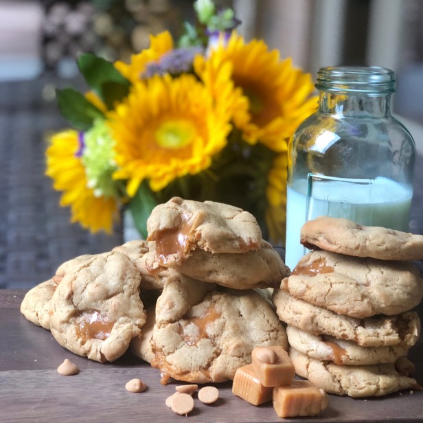 Preheat oven to 350. Place caramels in freezer for about 10 minutes or refrigerate for 30 minutes. Remove from fridge and then cut caramels in small dice (cooling them will greatly assist in the cutting process.) In a small bowl, combine flour, baking soda, baking powder, salt and cinnamon. Using a standing mixer with paddle attachment, cream butter and sugars together on high until smooth, creamy and fluffy. Add vanilla and egg and blend well. Turn mixer on low and add flour mixture and blend until combined. Next blend in peanut butter chips until evenly incorporated. Scoop out batter in a heaping tablespoonful and nestle 2 or 3 caramel bits in center of cookie. This will help prevent caramel from sticking to baking sheet during cooking process. If you have a few extra caramels place them on top of the cookie. Place cookies on baking sheet about 1 1/2 inches apart and bake for 10-12 minutes until tops of cookies begin to crack a bit and cookies are golden. Remove from oven and transfer to a cooling rack after 5 minutes to cool completely. Enjoy!
