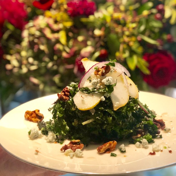A wonderful salad for fall that has such delicious, earthy flavors and nutrient-rich kale that adds texture.  For this salad, I slice the kale in very thin, horizontal strips and then took the extra step to massage the kale gently in between my hands to break up the cellulose of the leaves, making the kale more tender in a raw salad.  I love the flavor of gorgonzola in the salad, but if that is not your favorite cheese, you cold easily substitute a crumbled goat cheese or feta which would also work.  I love plating the salad on a large plate in a pile that provides vertical dimension and a lovely presentation.