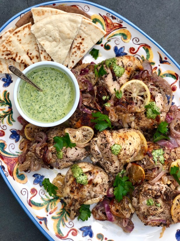 This recipe is closely adapted from Yotam Ottelenghi. I love all the middle eastern flavors. The Za’atar spice blend is delicious with the chicken and pairs so well the green tahini sauce. Most middle eastern markets carry the spice and you can also order from Penzey’s if it’s not available locally. I used the extra green Tahini sauce as a dressing for a salad. The original recipe used broth in the marinade, rather than buttermilk. I have found that buttermilk helps to tenderize the chicken during the marinating process. I added a bit of honey and additional oil to the tahini sauce to sweeten the sauce just a bit, but you could eliminate if desired. The original recipe added pine nuts toasted in butter as a garnish which would be a nice addition, but I forgot to include them when I prepared my dinner. A great make-ahead meal and delicious with roasted potatoes and a hearty salad, but be sure to marinate the chicken for best results and optimal flavor.