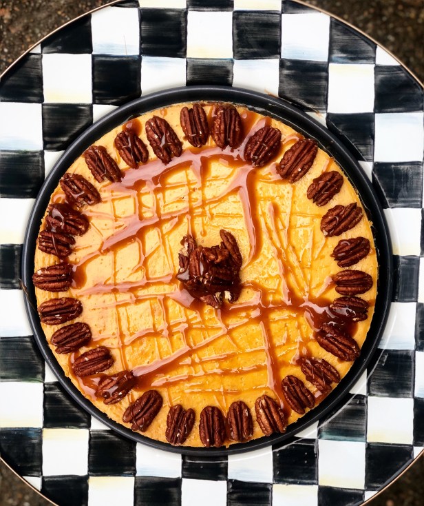 This cheesecake is the combination of a few recipes. One of the most important hints about making a good cheesecake is starting with the eggs and cream cheese at room temperature which enables them to blend together easily. It is also important not to over-beat the eggs which causes the cheesecake to crack during the baking process. I also used the food processor to combine the ingredients, rather than the mixer. By cooking the pumpkin mixture with the sugar and spices before combining it with the rest of the filling. The caramel sauce and pecans are the perfect accent for this fall dessert.