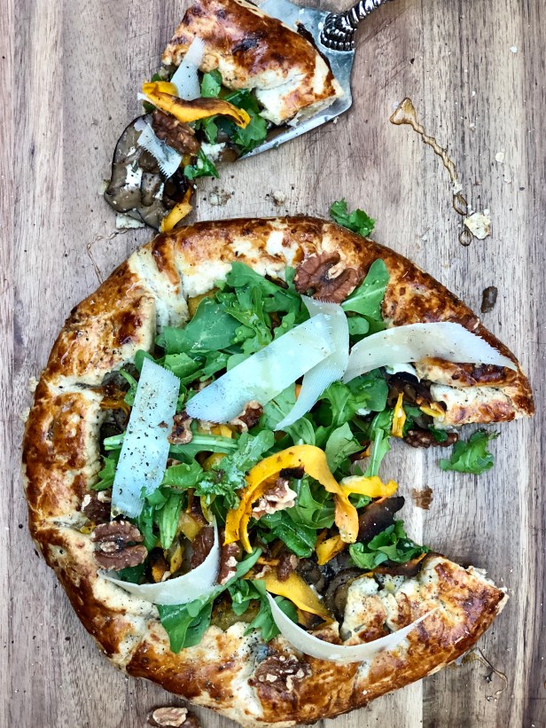 In essence, this is a fancy vegetarian pizza, with wonderful fall flavors. I love the butternut squash ribbons that add color, flavor and texture. The layers of vegetables are so good and I finish the tart with a drizzle of honey, toasted walnuts and a handful of fresh arugula that is so perfect with the savory roasted veggies. Don’t be intimidated by the crust. I DO use a food processor which truly does all the work for you and renders a delicious crust. For the butternut squash ribbons, you can use a simple vegetable peeler or a mandolin if that is easier. The nice thing about this dish is that it is a rustic tart and does not have to be perfect. The imperfection makes it all the more appealing. It would be perfect for a light dinner with a nice salad and chilled glass of wine.