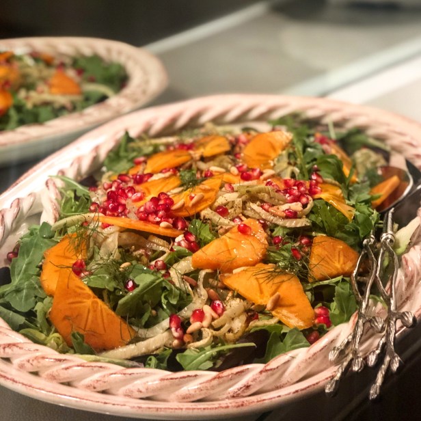 This colorful salad is a perfect accompaniment to your holiday table alongside all the rich offerings that usually grace the table at this time of year. It is such a beautiful combination of colors and flavors and easy enough to prepare any day of the week. I love the peppery, slightly bitter taste of the arugula with the sweetness of the roasted fennel and persimmons. If you don’t like arugula, you can substitute any other greens or even use a mix of your choice. The Pomegranate arils are not only beautiful, but add a wonderful crunch and tanginess. If you wanted to add feta or goat cheese for a more substantial salad, it would wok well with all these flavors.