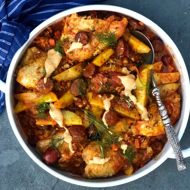 Add the chicken, sausage and potatoes back to the pan along with pureed roasted tomatoes, ouzo, and 1 cup of stock to the casserole. Bring to a boil over high heat, cover p and simmer over low heat until the potatoes and chicken are cooked through (about 30-35 minutes)are half-cooked, 25 minutes. Keep warm.